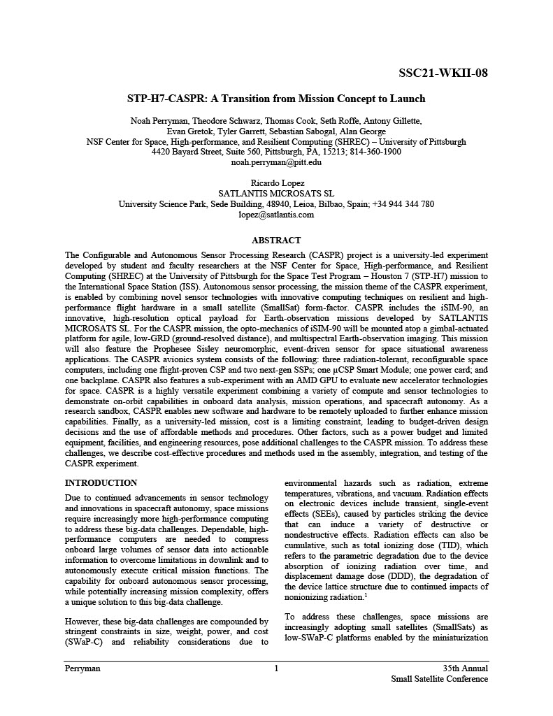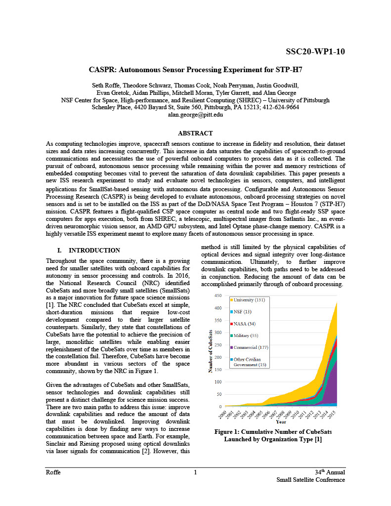 Configurable and Autonomous Sensor Processing Research (CASPR) is designed to enable effective onboard processing for next-generation sensors and applications. CASPR is a Department of Defense payload on the Space Test Program - Houston 7 (STP-H7) pallet aboard the International Space Station. It was developed, designed, and built by the students and faculty of the NSF Center for Space, High-performance, and Resilient Computing at the University of Pittsburgh. Explore below to learn more about this exciting research testbed.