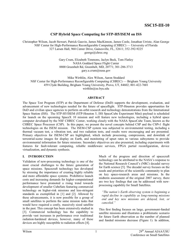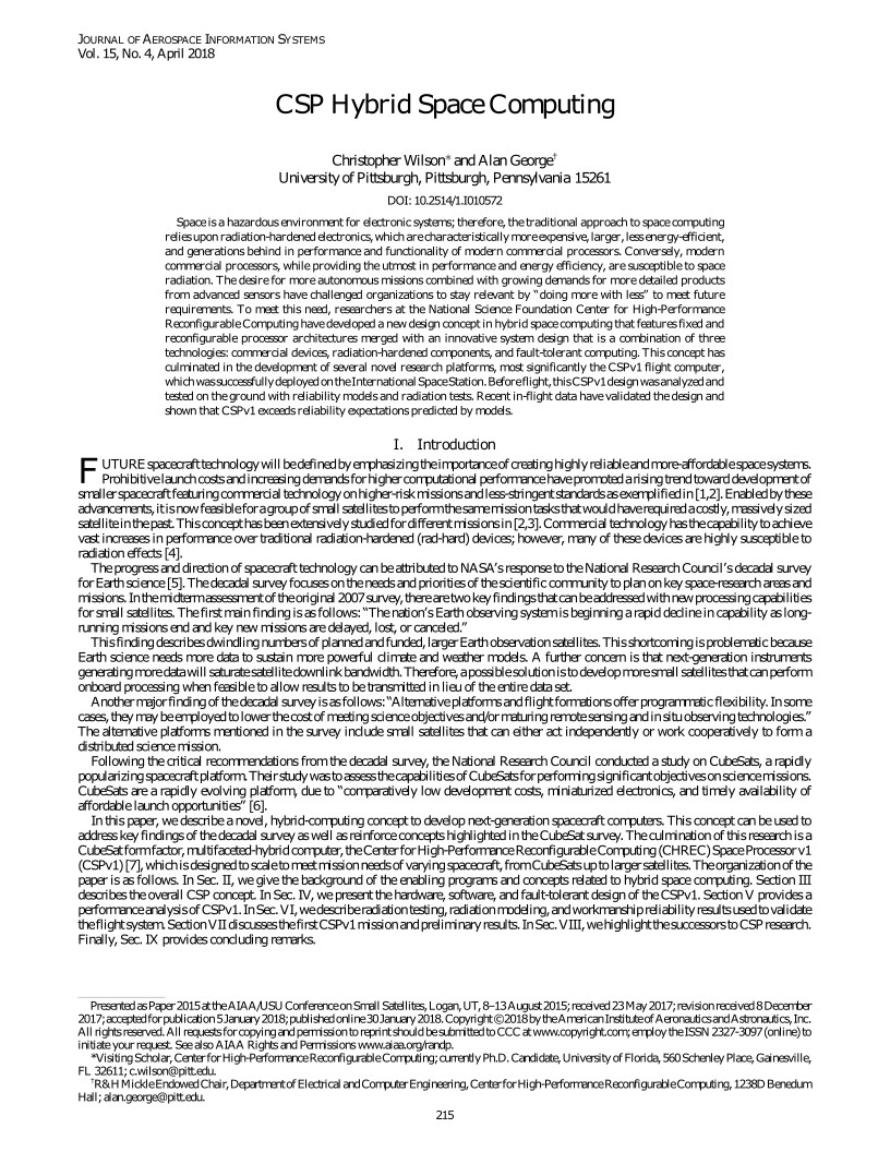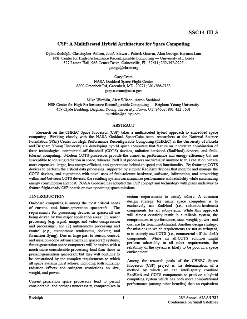 Designed by SHREC students, CSP is one of the first computers containing commercial-off-the-shelf (COTS) and radiation-hardened components to provide a radiation-tolerant yet powerful computing for space. CSP employs a Xilinx Zynq-7020 system-on-chip containing an Artix-7 FPGA fabric and a dual-core ARM Cortex-A9 processor.