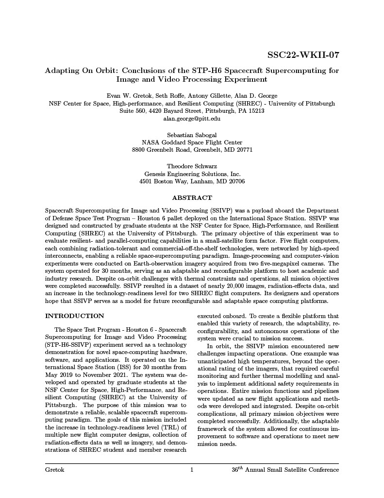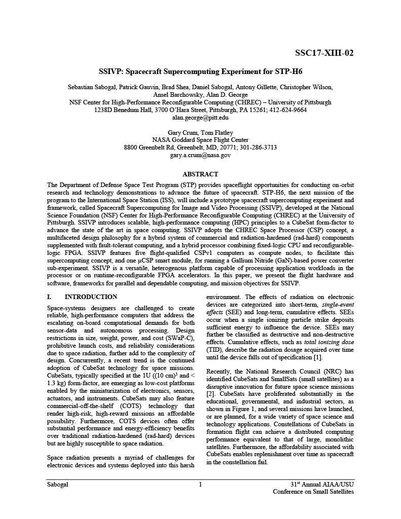 Designed as a successor to the CSP, the SHREC Space Processor (SSP) provides the same hybrid-computing concept with more FPGA acceleration power. SSP employs a Zynq-7045 system-on-chip with a Kintex-7 FPGA fabric and a dual-core ARM Cortex-A9 processor, supporting the addition of multi-gigabit transcevers and dedicated programmable-logic DDR memory.